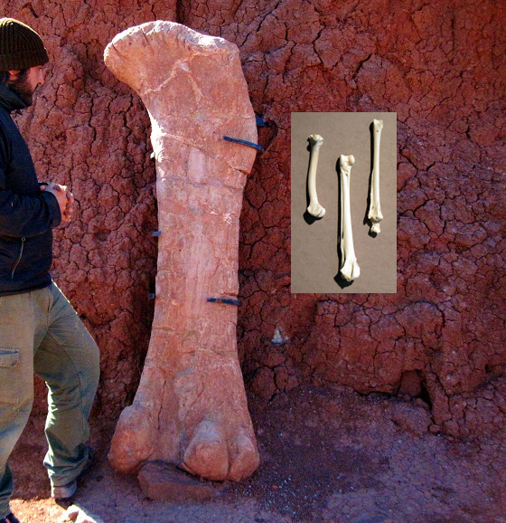 And just why do we refer to these critters as 'dinosaurs'? Take a look at the comparison on the right. The inset is of some chicken thigh bones, the larger one (with someone standing in for Alley Oop for scale) has been dug up in Argentina*. Except for the scale, they are essentially the same bone, altho one of them is now fossilized. What a snack that would've made, eh? "Heathens", really? Well, not in the religious sense; these two have taken up residence beneath (and inside) the heath in the front. |
