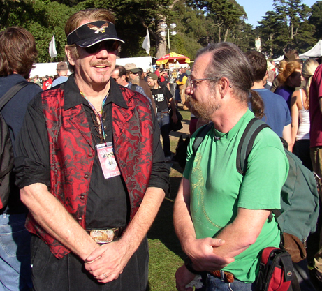 bout with cancer. He was 74 years old. Born in Little rock, AR, Hicks (pictured above at the 2005 Chet Helms Memorial Tribal Stomp drunkenly jiving with Yours Truly) was one of the founders of the seminal San Francisco psychedelic scene band The Charlatans. |
