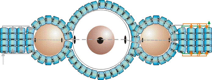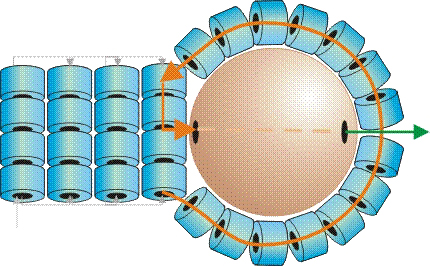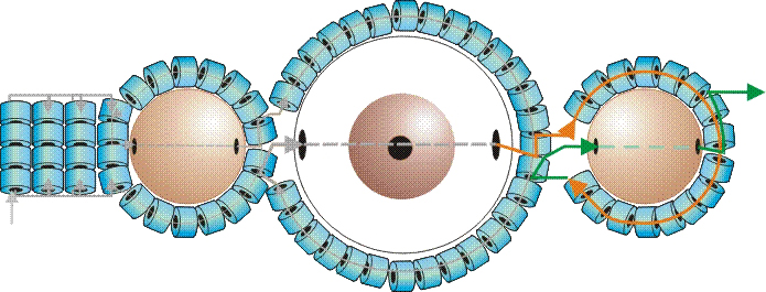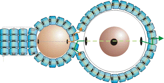 Step 2 Add first accent bead Exiting the end of the last square-stitch row, pick up enough beads to go completely around your accent bead (including the four beads of the last row you stitched). Stitch up through the first two beads of your last square stitch row (all you’re doing here is snugly encircling your accent bead with seed beads ). Exiting the second bead of the last square-stitch row, go through the accent bead. (figure 3) |