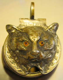 Joy Kennedy sends us this pic of her antique mustard cellar with a cast metal cat head for a lid. It was missing an eye, and we managed to match it for her. Ya gotta admit, it sure beats an eye patch! | ||||||